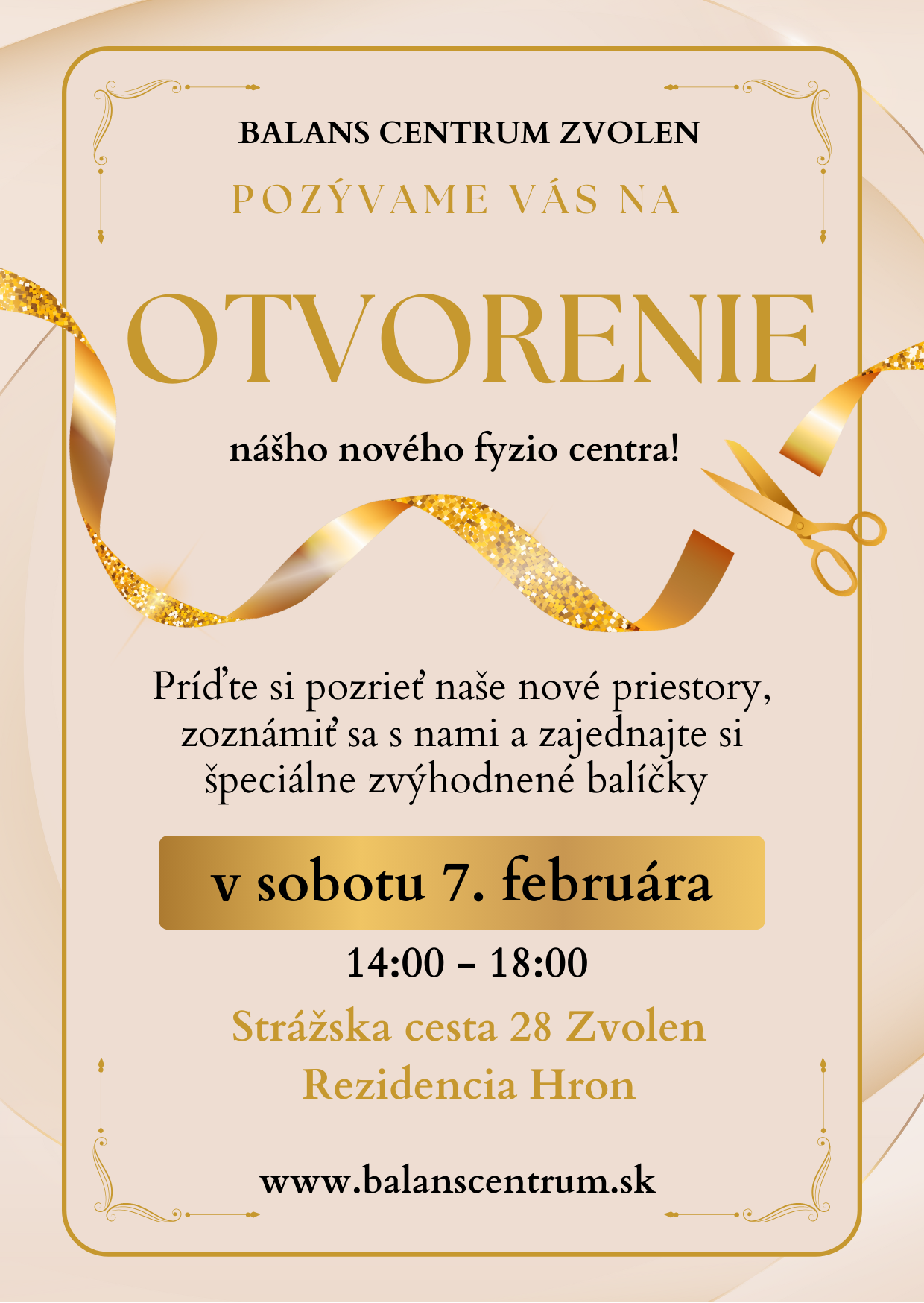 S radosťou Vás tiež pozývame na naše slávnostné otvorenie 7.2. (v sobotu), kde Vás radi uvidíme. Na mieste si budete môcť zajednať aj špeciálne pripravené zvýhodnené balíčky na fyzioterapiu alebo masáže.